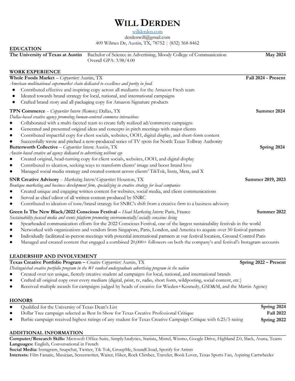 Like I said earlier, my name's Will. I'm a graduate of the Texas Creative Portfolio Program, and I somehow managed to earn a B.S. degree in Advertising from the University of Texas at Austin. I like reading books about people from other countries, listening to every conceivable genre of music, and eating a concerning quantity of chicken and rice.